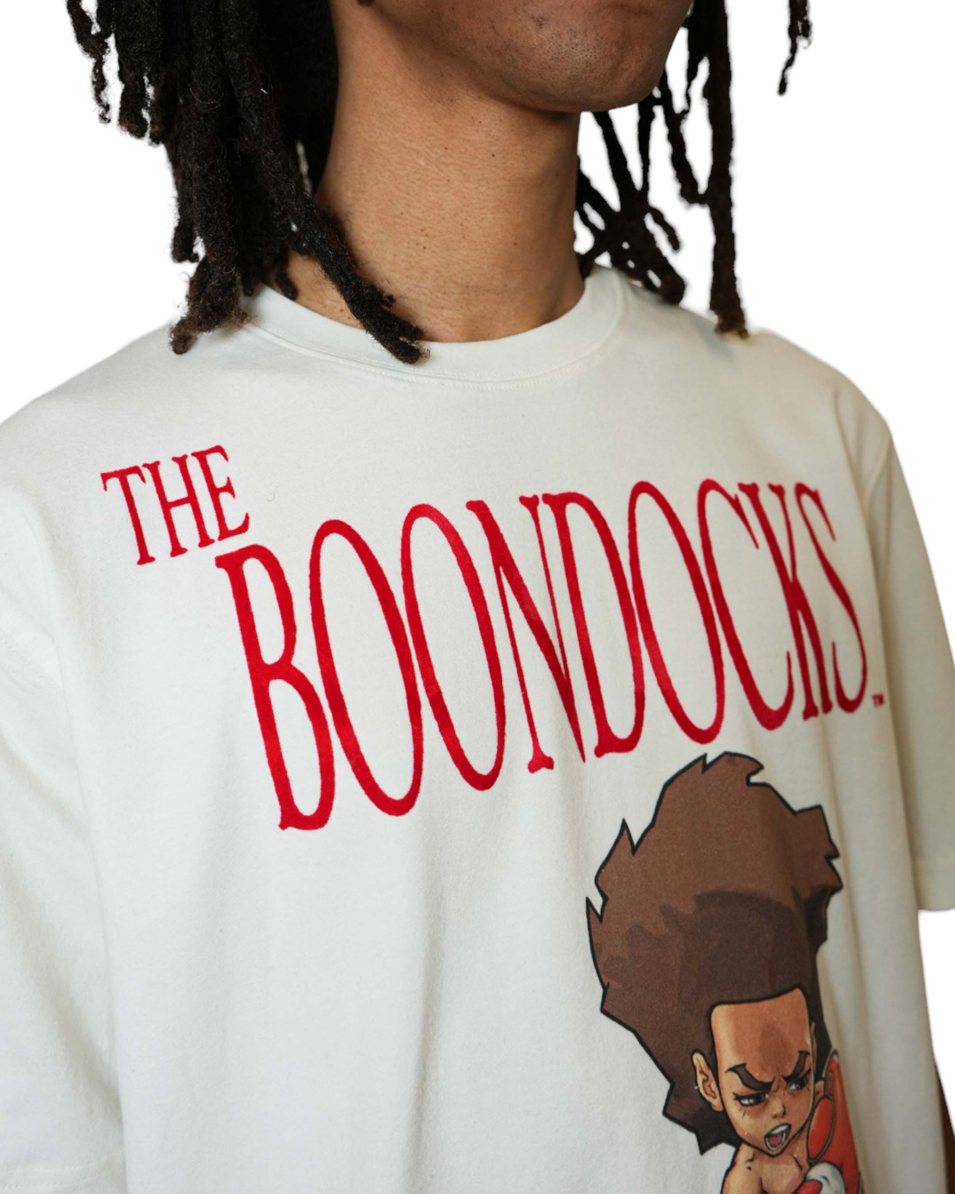 A knockout moment, captured in cotton. The Huey Knockout White T-Shirt brings one of The Boondocks' most iconic showdowns to life, featuring Huey Freeman standing triumphant over a laid-out Uncle Ruckus. The bold red The Boondocks™ logo is detailed with high-pile flocking across the chest, while the oversized print graphic adds punch and personality. A must-have statement piece for any fan of the series.