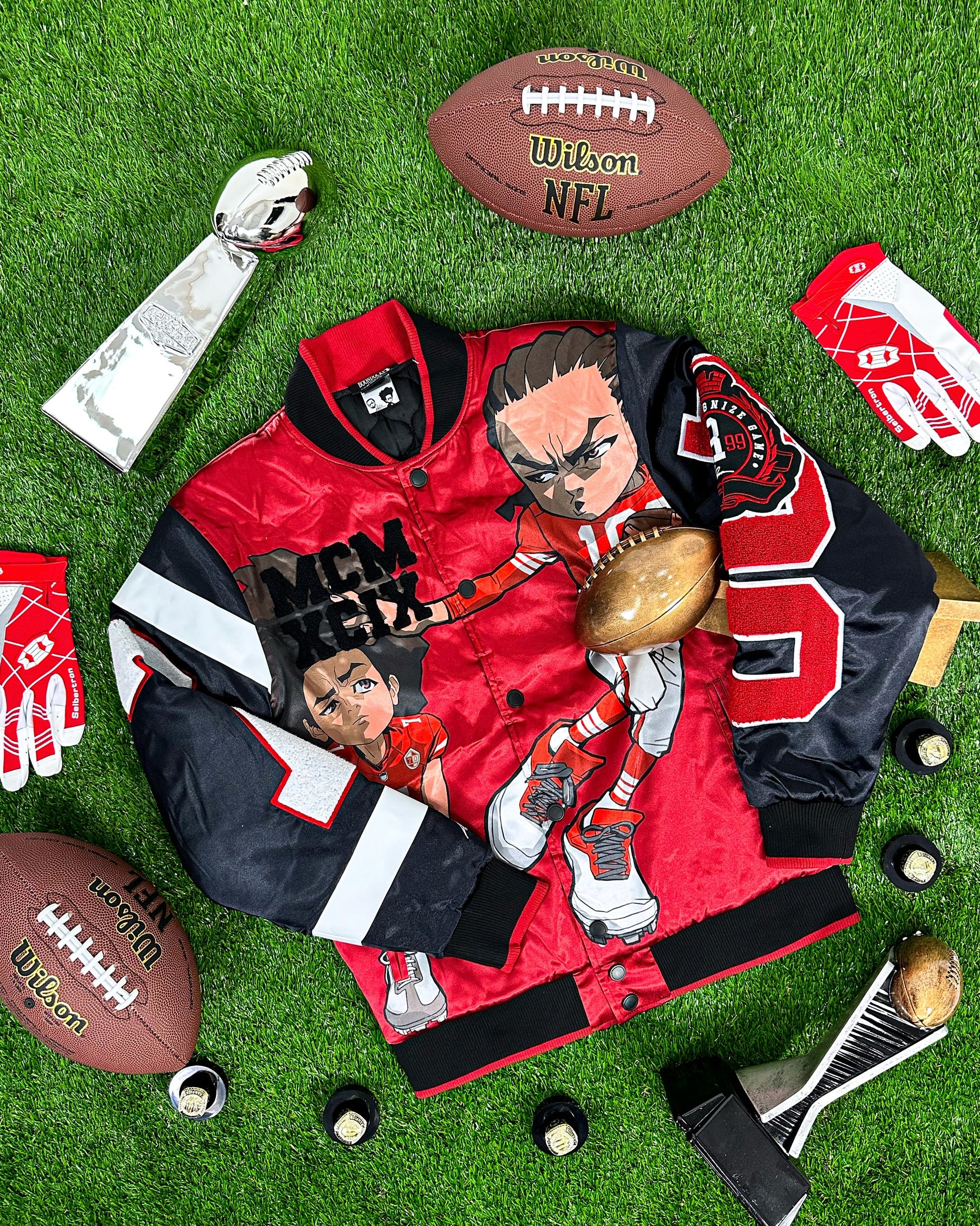 Introducing the latest addition to our collection, The Boondocks Huey & Riley Football Crimson Satin Varsity Jacket. This iconic varsity jacket now comes in an exciting new style, featuring a vibrant crimson satin finish and striking football-inspired graphics that pay homage to Huey and Riley Freeman's bold personalities.